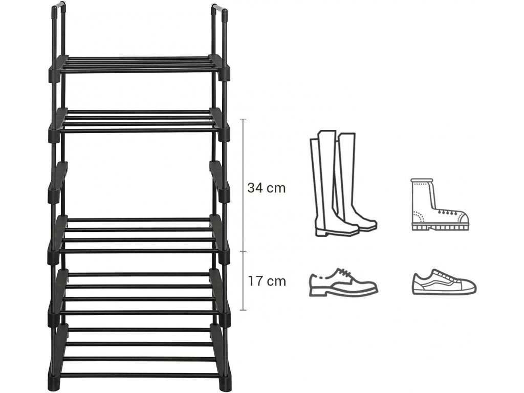 Tento botník se 6 policemi lze sestavit v různých tvarech. Můžete ho proto rozdělit např. na 2 malé botníky a používat tak botníky samostatně v různých místnostech. Regál se snadno montuje, a proto na jeho složení nepotřebujete žádné nářadí.