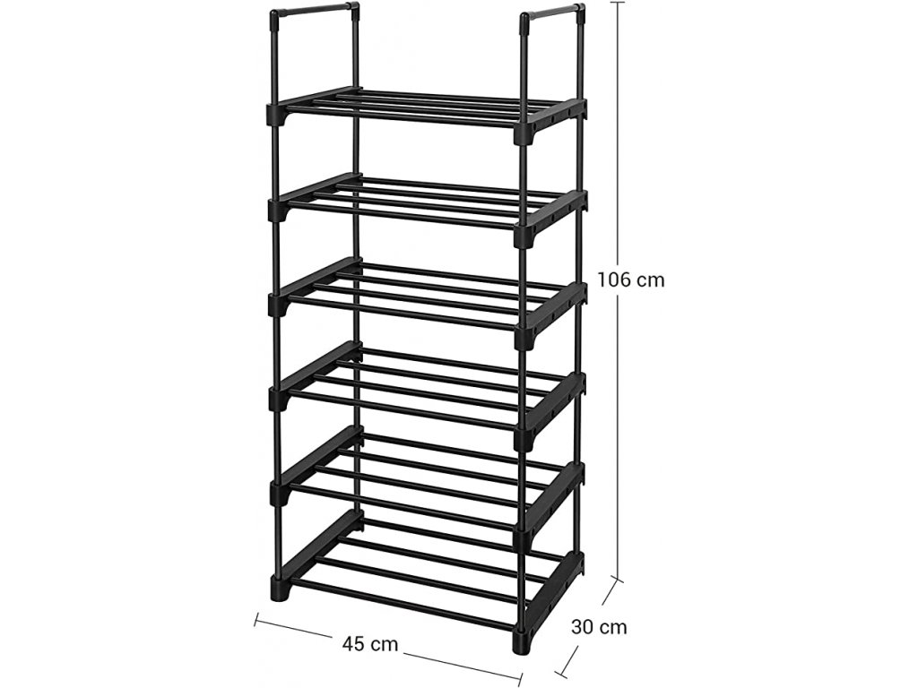 Tento regál je vyroben ze zesílených kovových trubek a vysoce kvalitních plastových spojek, a proto poskytuje Vašim botám silnou oporu. Botník je robustní a má dlouhou životnost. Ochrana proti překlopení mu navíc propůjčuje vysokou stabilitu.