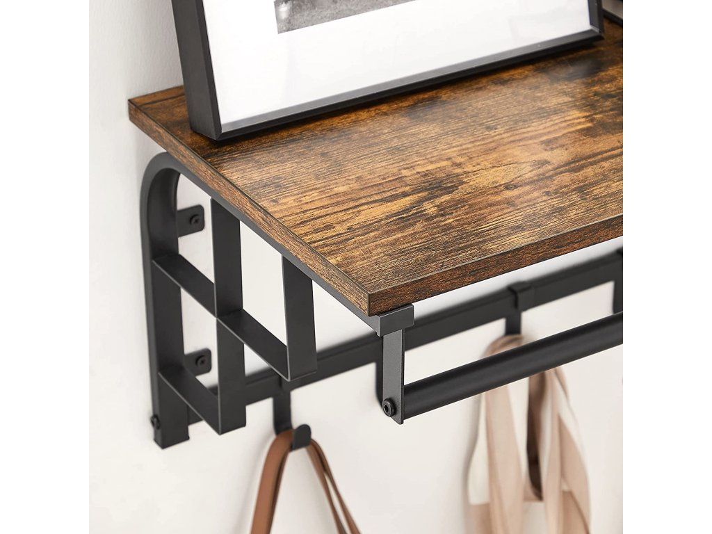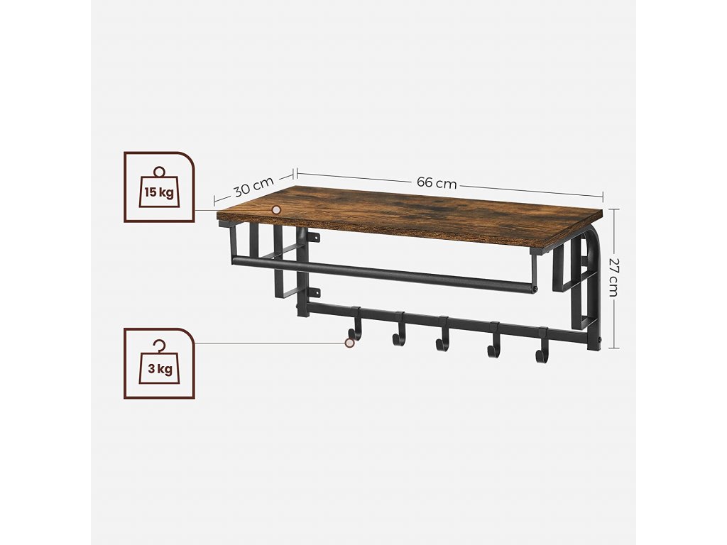 Nástěnný věšák má kombinaci policové desky, tyče a odnímatelných háčků. Policová deska nabízí dostatek místa pro klíče, dekorace nebo další drobnosti. Tyč na věšení oblečení nebo tašek zajišťuje, že vaše bundy nebo tašky budou vždy po ruce. Odnímatelné háčky přidávají další možnosti úložného prostoru.